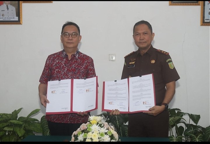 Wali Kota Tomohon Caroll J. A. Senduk, S.H. bersama Kepala Kejaksaan Negeri Tomohon Dr. Reinhard Tololiu, S.H., M.H. menandatangani nota kesepakatan Pemerintah Kota Tomohon dan Kejaksaan Negeri Tomohon tentang Pengawasan Pelaku Tindak Pidana Pasca Keadilan Restoratif di Wilayah Hukum Kejaksaan Negeri Tomohon dan Pengawasan Pelaku Penyalahgunaan Narkotika Pasca Keadilan Restoratif Rehabilitasi.