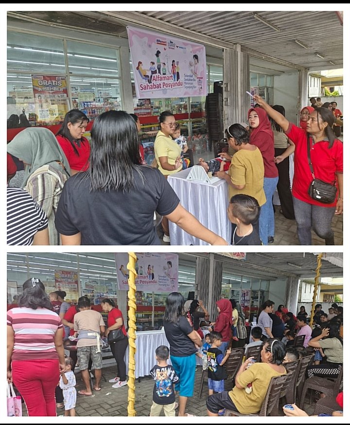 Salah satu kegiatan berlangsung di Alfamart Singkil di Manado, Selasa (13/1/2026). Para ibu terlihat antusias membawa anak-anak mereka untuk mengikuti pemeriksaan oleh kader Posyandu bersama dinas kesehatan setempat.