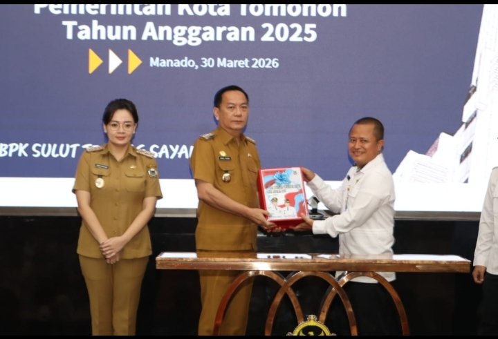 Walikota Tomohon didampingi Wakil Walikota menyerahkan Laporan Keuangan Pemerintah (LKP) Kota Tomohon Unaudited Tahun Anggaran 2025 kepada Kepala BPK Perwakilan Provinsi Sulawesi Utara Bombit Agus Mulyo, S.E. M.M., Ak., CA., ERMAP., GRCP., GRCA., CSFA.