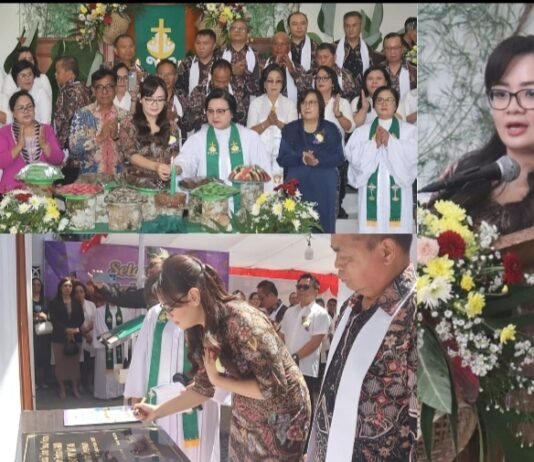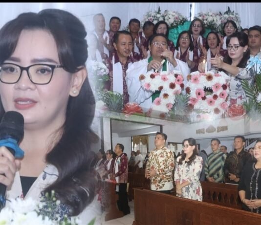 METROklik - Wakil Walikota (Wawali) Tomohon, Sendy Rumajar SE MIKom, yang juga Ketua Panitia Hari-Hari Raya Gereja GMIM Baitlahim Talete Satu didampingi suami Ariel Warouw SH, menghadiri ibadah syukur Hari Ulang Tahun ke-79 GMIM Bait-lahim Talete Satu, Wilayah Tomohon Sentrum, Minggu (27/7/2025).